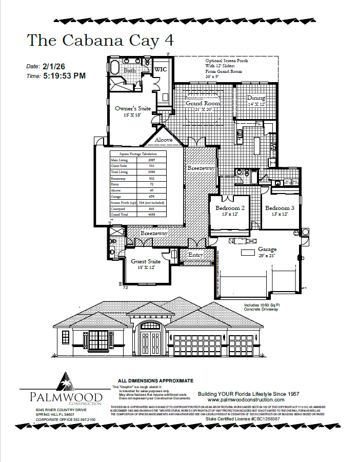Luxury meets livability in the Cabana Cay 5—an elegant 4-bedroom, 3-bath home designed for Florida living. With 2,588 square feet of refined space, this Estate Series model by Palmwood Construction offers a perfect balance of open-concept design, smart functionality, and elevated finishes.